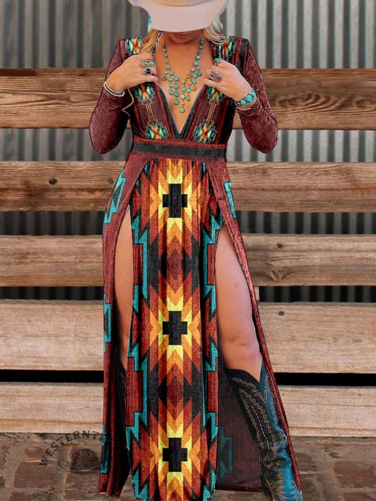 Women's Aztecs Slit Deep V Neck Dress