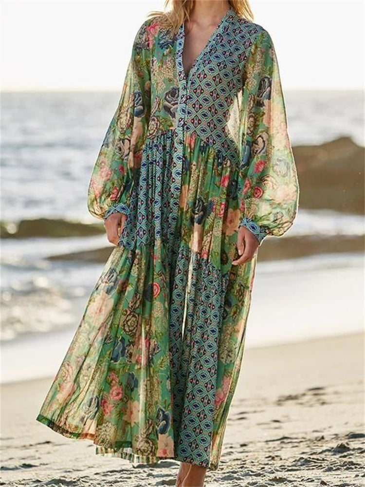 Wisherryy Boho Floral Patchwork Ruffle Maxi Dress