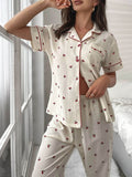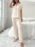 Cherry Print Contrast Piping Blouse & Pants Pajamas Set