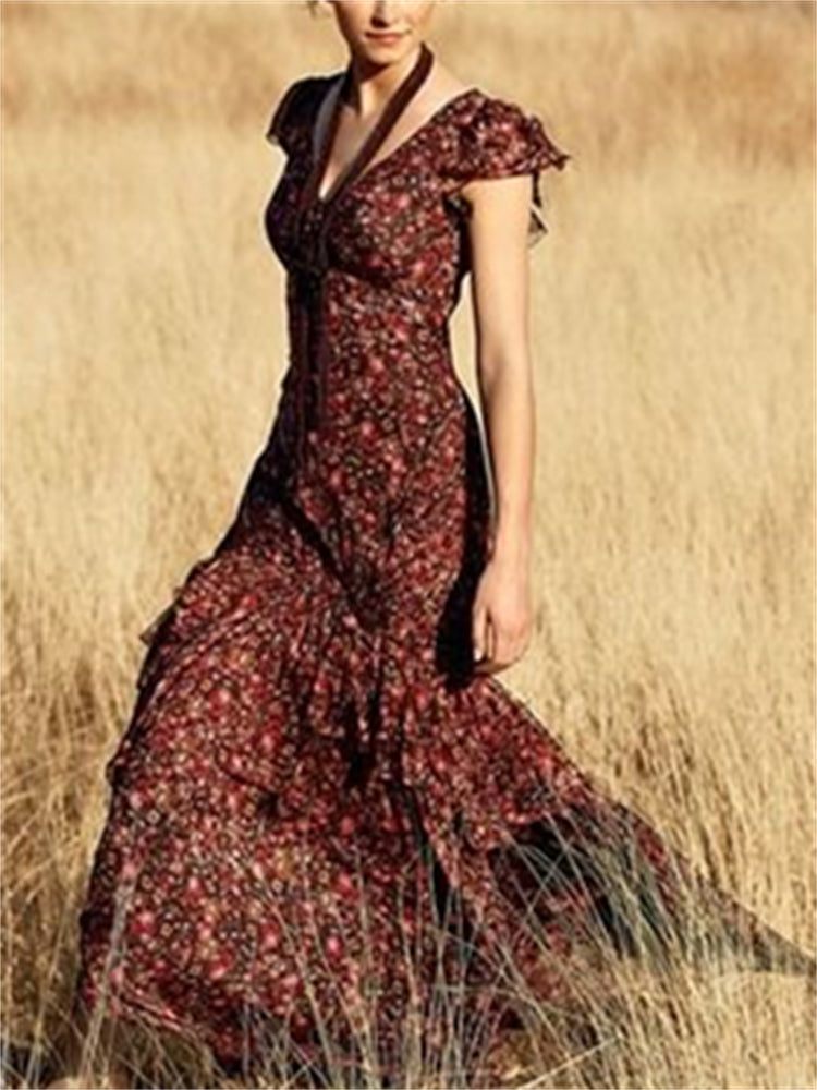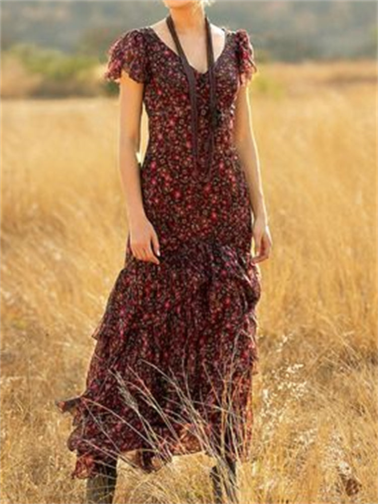 Floral Tiered Ruffle V Neck Flowy Maxi Dress