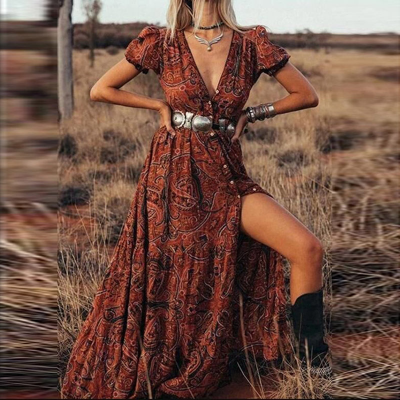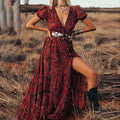 Wisherryy Printed V-Neck Short Sleeve Bohemian Resort Maxi Dress