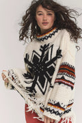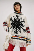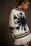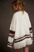 Too-cool and cozy, this one-of-a-kind sweater features a soft wool-blend and oversized fit with contrast knit detailing and fun fringe trim.