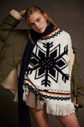 Features: Soft wool-blend, mock-neckline, drop-shoulder sleeves, contrast knit detailing, fringe trim, ribbed cuffs