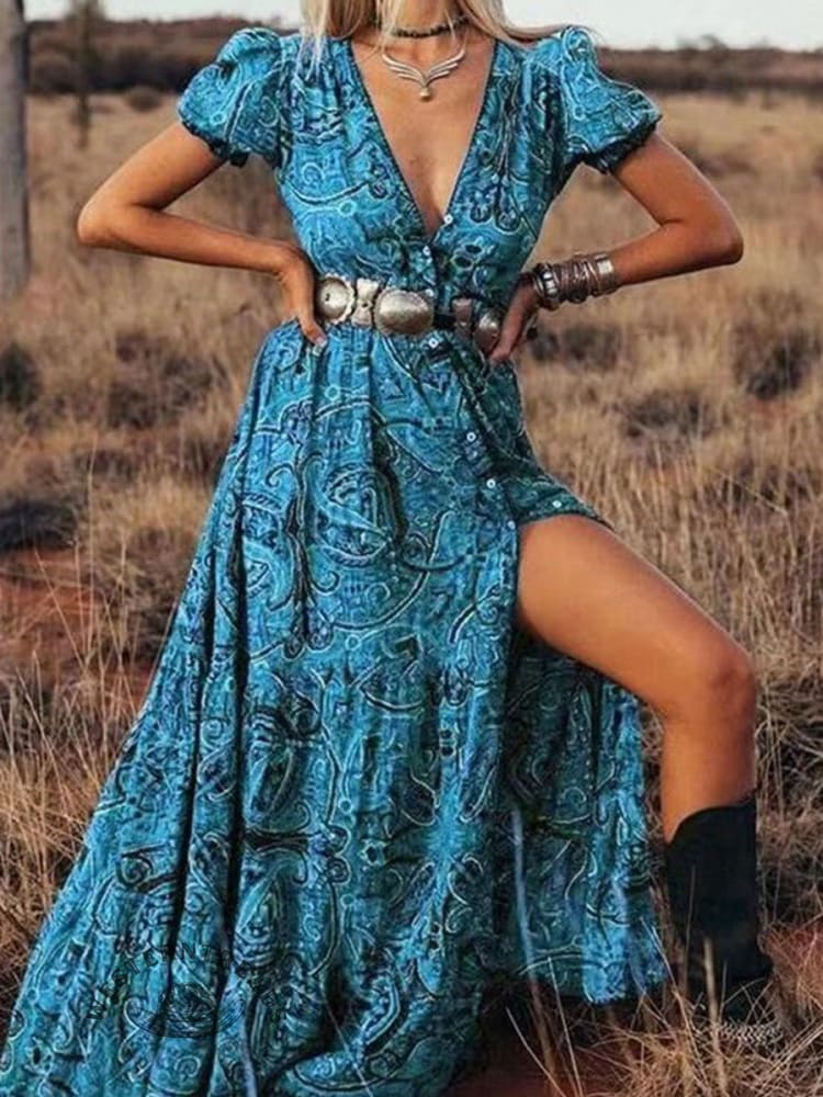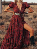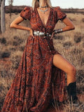 Women's Printed V-Neck Short Sleeve Bohemian Resort Maxi Dress
